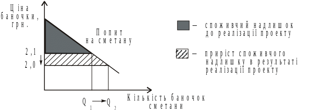 Під споживчим надлишком розуміють різницю між максимальною ціною, яку споживач готовий заплатити за одиницю продукції, і тією реальною величиною ціни, яку він заплатив фактично. Проілюструємо зміну споживчого надлишку на прикладі. Розглядається проект заміни на молокозаводі старої низькопродуктивної лінії виробництва сметани на нову, більш продуктивну. Це дасть змогу знизити собівартість 1 баночки на 15 %, а ціну — з 2,1 грн. до 2,0 грн. На гіпотетичній лінії попиту на сметану (рис. 27), вважаючи, що попит на сметану є еластичним, покажемо величину споживчого надлишку до і після проекту. Як бачимо, внаслідок збільшення обсягу попиту на сметану споживчий надлишок до реалізації проекту значно нижчий, ніж після його реалізації.