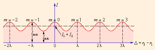 Интерференционный максимум (светлая полоса) достигается в тех точках пространства, в которых Δ = mλ (m = 0, ±1, ±2, ...), где Δ = r2 – r1 – так называемая разность хода. При этом Imax = (a1 + a2)2 > I1 + I2. Интерференционный минимум (темная полоса) достигается при Δ = mλ + λ / 2. Минимальное значение интенсивности Imin = (a1 – a2)2 < I1 + I2. На рис. 3.7.4 показано распределение интенсивности света в интерференционной картине в зависимости от разности хода Δ.