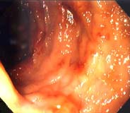Колоноскопия: слизистая оболочка подвздошной кишки в виде «булыжной мостовой», слизистая оболочка ободочной кишки представлена чередованием пораженных и непораженных зон (неравномерный отек чередуется с участками глубоких изъязвлений). Выраженная контактная кровоточивость.