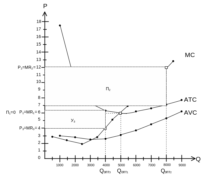 Рис. 1. Динамика затрат фирмы (AVC, АТС, МС).