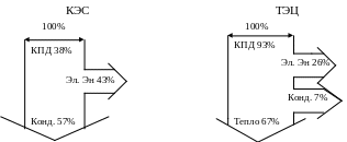 Расход энергии может быть в виде тепла и электрической энергии. В этом и состоит электрический смысл комбинированной выработки тепла и электроэнергии: на ТЭЦ тепло высокого потенциала используется для выработки электроэнергии, а тепло низкого потенциала, для теплоснабжения.