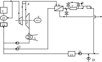 Из котла 1 пар под давлением 14 – 15 МПа поступает в теплофикационную турбину 2 электрогенератора 3. В турбине давление пара снижается до 0,2 МПа. Затем пар поступает в камеру отбора 4, откуда часть пара поступает в подогреватель 6, где обратная вода из тепловой сети подогревается и идет на теплоснабжение, а часть пара поступает во вторую ступень турбины 2’, в которой, расширяясь до 0,06 МПа совершает дополнительную работу по выработке электроэнергии. Отработанный пар поступает в конденсатор 5, где отдает тепло охлажденной воде. Конденсат из 5 и водоподогревателя 6 насосами 13 подается в деаэратор 14 и регенератор подогрева 15 и далее в котел 1. Обратная вода из тепловой сети насосом 11 через грязевик 12 подается в котел. Потери воды восполняются из водоподготовки насосом 10. Из подогревателя вода поступает на горячее водоснабжение 8 и отопительные приборы 9 и далее в обратную линию. При понижении температуры наружного воздуха включается тепловой котел 7.