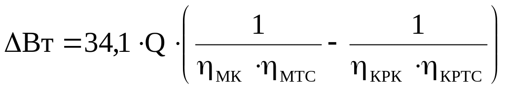 Экономию топлива Вт при переходе от теплоснабжения от мелких котельных к теплоснабжению от крупных, более экономичных котельных можно оценить по формуле: