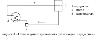 При работе с градирнями тёплая вода поступает в них, где в результате частичного испарения и контакта с восходящим потоком воздуха охлаждается. Затем вода собирается в ёмкости, находящиеся под градирней, и насосом вновь подаётся на охлаждение конденсаторов турбин и д.р. аппаратов (рис.3).