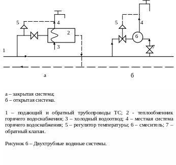 Двухтрубные водяные системы (открытые и закрытые) различаются технологией приготовления воды для местных систем горячего водоснабжения.