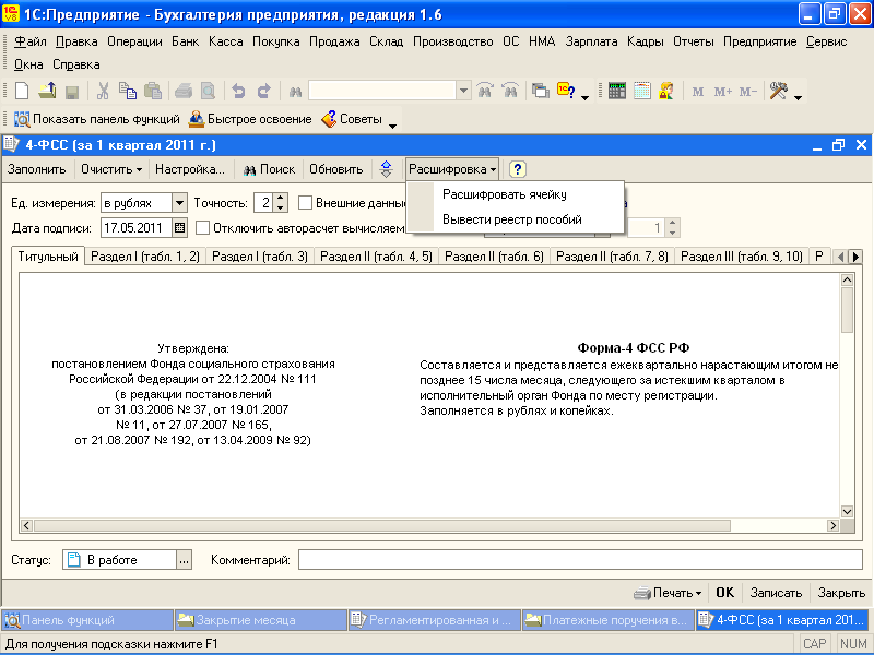 Отчет «4-ФСС» предназначен для подготовки расчетной ведомости по средствам Фонда социального страхования Российской Федерации по форме, утвержденной постановлением Фонда социального страхования Российской Федерации от 22.12.2004 № 111 (в редакции постановлений от 31.03.2006 № 37, от 19.01.2007 № 11, от 27.07.2007 № 165, от 21.08.2007 № 192).