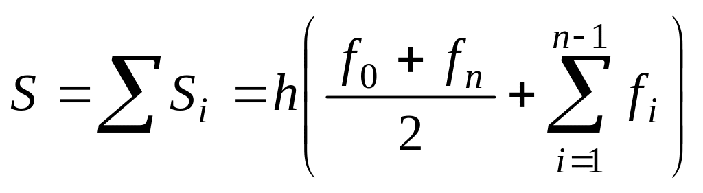 Восстановим перпендикуляры из каждой точки до пересечения с графиком функции f(x). Если заменить полученные криволинейные фрагменты графика функции отрезками прямых, то тогда приближенно площадь фигуры, а следовательно и величина определенного интеграла оценивается как площадь всех полученных трапеций. Обозначим последовательно значения подынтегральных функций на концах отрезков f0, f1, f2,..., fn и подсчитаем площадь трапеций.