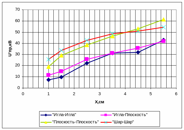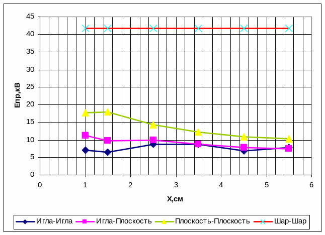 В ходе проведения лабораторной работы были исследованы четыре типа воздушных промежутков. Для каждого из них были измерены значения напряжения пробоя и напряженности пробоя в зависимости от расстояния между электродами. Эти же значения были рассчитаны по эмпирическим формулам. По получившимся зависимостям были построены графики (рисунки 2 – 5).