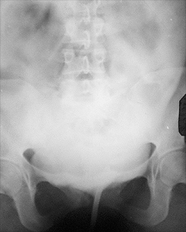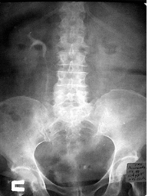 Объективно: Состояние больного тяжелое. Тахикардия, АД 90/60 мм рт. ст. Положение с приведенным к животу левым бедром, резкая болезненность при его разгибании, выбухание в поясничной области слева, болезненность в поясничной области, особенно в левом костовертебральном углу, защитное сокращение поясничных мышц при легкой пальпации, сколиоз поясничного отдела позвоночника.