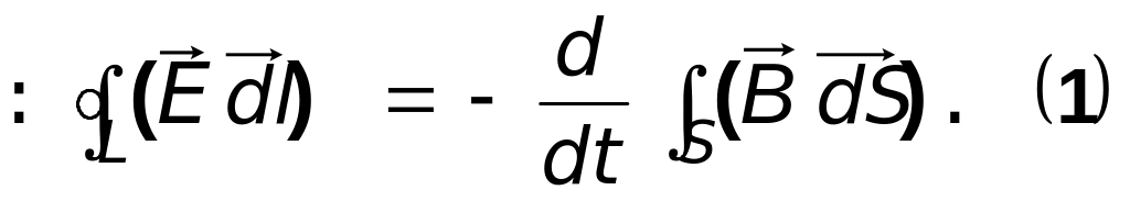 Известно, что появление ЭДС в контуре при его движении в МП м-т быть объяснено перемещением ЭЗ под действием силы Лорентца. Возникновение ЭДС регистрировалось также в неподвижном проводнике при условии переменного МП, проявлением силы Лорентца его не могли объяснить. Дж.Максвеллом было предположено, что переменным МП в окружающем пространстве всегда возбуждается вихревое ЭП, к-рое является причиной возникновения индукционного тока в контуре. Teм самым, явление, наблюдавшееся Фарадеем, получило обобщение и закон ЭМИ получил окончательную формулировку (1). С изменением в пространстве МП должно быть связано возникновение сцепленного с ним вихревого ЭП. Ур-ние (1) и представляет 1-ое ур-ние системы УМ.