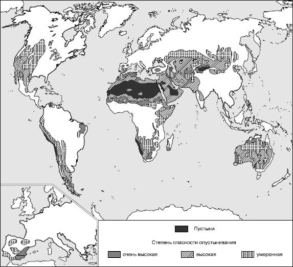Очень высокая степень риска означает, что соответствующая территория неизбежно подвергнется интенсивному опустыниванию, если не будут предприняты решительные меры по борьбе с ним. Регионы с такой степенью риска занимают 3 млн км², преимущественно в Азии и Африке. Высокая степень риска также означает угрозу опустынивания, хотя и не столь быстрого. Подобные регионы занимают 16,5 млн км². Наконец, умеренная степень риска означает, что региону может грозить опасность опустынивания, если не будут изменены существующие условия. Площадь таких земель оценивают в 18 млн км².