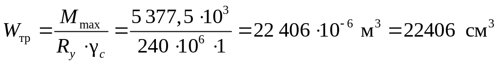 Вычисляется требуемый момент сопротивления поперечного сечения в предположении работы материала в упругой стадии. Расчетное сопротивление стали С255 Ry = 240 МПа для проката толщиной до 20 мм (см. табл. 51* [3]), коэффициент условия работы конструкции с = 1 (см. табл. 6* [3]);