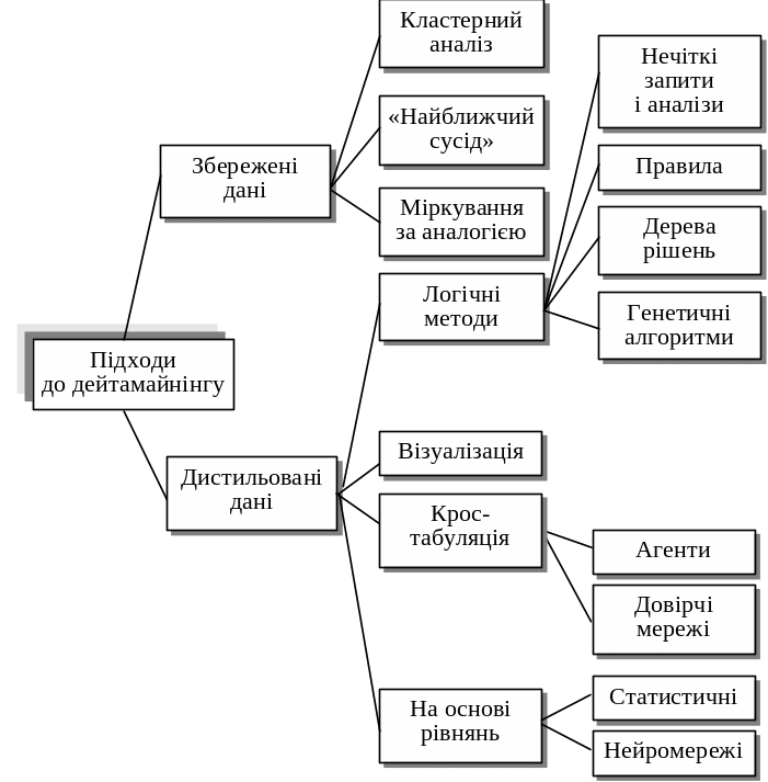 На рис. показано дерево методів дейтамайнінгу, де відображені основні види і підвиди методів, причому гілкування можна продовжити, оскільки низка методів, наприклад, кластерний аналіз, нейромережі, дерева рішень мають багато різновидів. Оскільки деякі з наведених методів були розглянуті поверхово раніше в контексті ідентифікації інструментів штучного інтелекту чи як складові деяких продуктів дейтамайнінгу, то зупинимося на короткому аналізі складових дерева методів дейтамайнінгу. Докладнішому висвітленню нейромереж, генетичних алгоритмів і програмних агентів будуть присвячені окремі параграфи даного розділу.