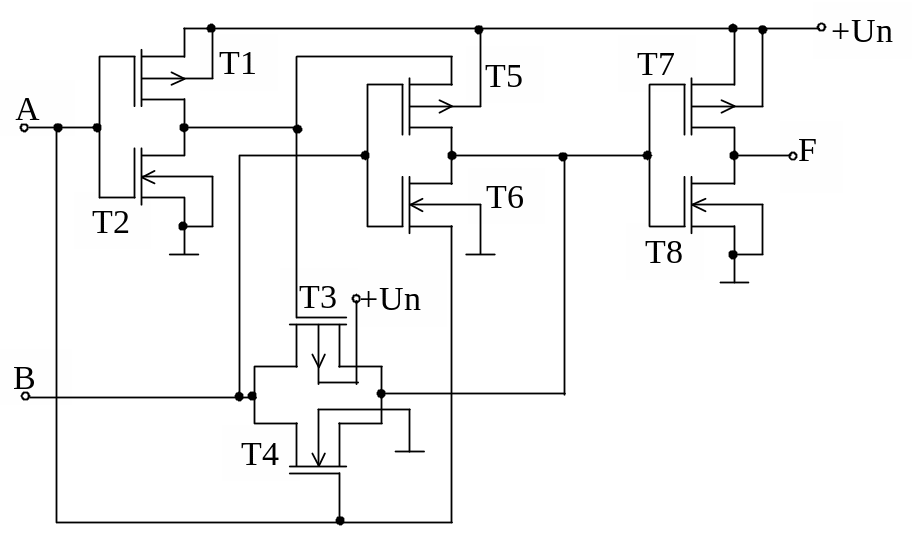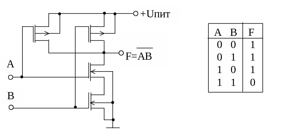 Если на входах A или B (или на обоих) логическая единица, то откроется один или оба из нижних транзисторов, при этом закроется один или оба верхних транзистора, тогда на выходе логический ноль. Если на обоих входах логический ноль, то закроются оба нижних и откроются оба верхних транзистора, при этом на выходе логическая единица.