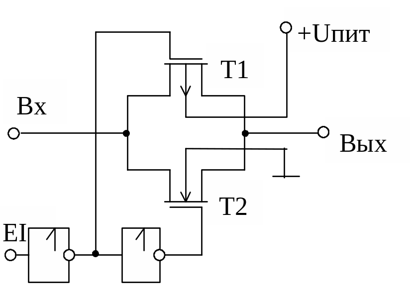 1. На управляющем входе EI = 1. На выходе первого управляющего инвертора 0, значит и верхний p–МОП транзистор T1 открыт, при этом на выходе второго инвертора 1, значит и нижний n–МОП транзистор T2 открыт. Следовательно в ключе открыты оба транзистора.