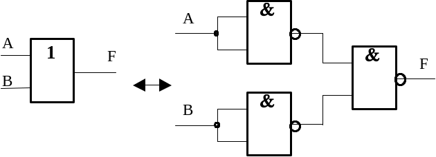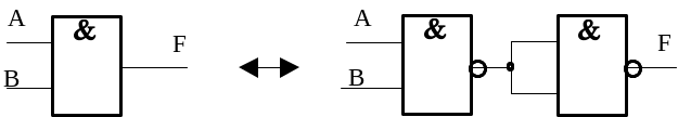 Благодаря этому переходу от И к ИЛИ и удается с помощью однотипных элементов инвертирующего базиса получать все остальные логические функции. Об этом говорят два постулата де 'Моргана:
