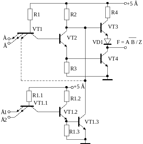 Если входные многоэмиттерные транзисторы таких микросхем имеют по несколько входов И, то получается схема логического элемента ЛР, – И–ИЛИ–НЕ, очень распространенная в ТТЛ (в ТТЛ сериях выпускается тринадцать типов логических элементов И–ИЛИ–НЕ).