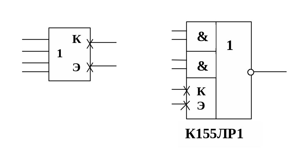 В некоторых видах этих микросхем И–ИЛИ–НЕ точки соединений коллекторов и эмиттеров подведены к выводам микросхемы, как показано на рис. 7.2.1 пунктирными линиями, что позволяет подключать дополнительные входные каскады с целью расширения по ИЛИ. При изображении логического элемента И–ИЛИ–НЕ или расширителей с выходами коллектор и эмиттер эти выводы отмечают наклонными крестами (см. рис. 7.2.2), в отличие от логических выводов. На обозначенных крестами выводах микросхем потенциалы могут отличаться от уровней, заданных требованиями для логических уровней.