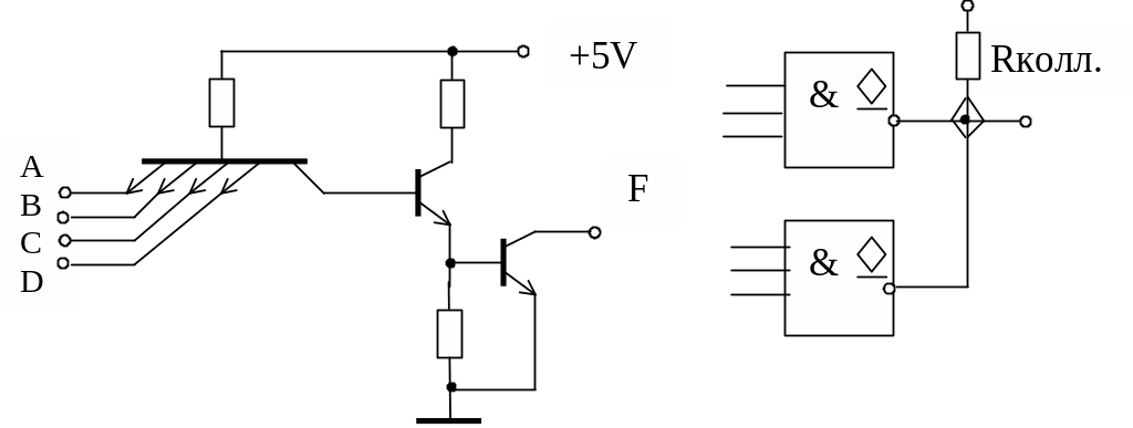 Рис.7.3.1. Схема логического элемента с выходом с открытым коллектором (ОК) и способ параллельного подключения двух таких выходов к одной линии.