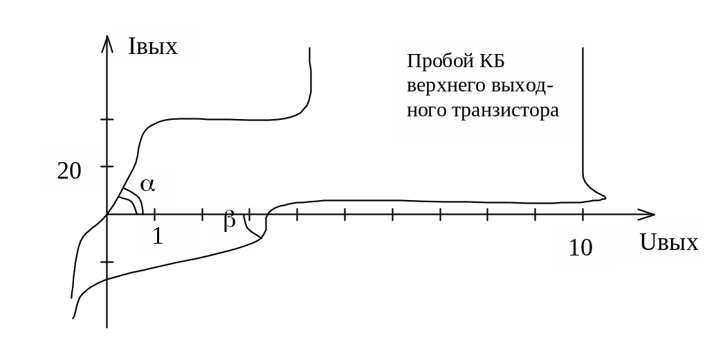 Внутренний резистор коллекторной нагрузки верхнего выходного транзистора микросхемы определяет наклон нижней ветви характеристики в области чуть ниже нуля ординат: