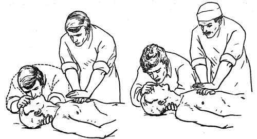 Обычно при утоплении паралич дыхательного центра наступает через 3-5 минут, а сердце перестает работать через 15 минут. В случае, если дыхания нет, а сердце продолжает работать, надо не мешкая делать искусственное дыхание любым, известным способом со скоростью 15-18 дыханий в минуту. Если же отсутствует и сердечная деятельность, нужно одновременно делать закрытый массаж сердца.