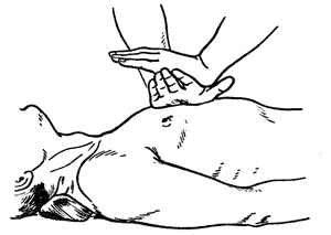 Непрямой массаж сердца На догоспитальном этапе, как правило, проводится закрытый массаж, при котором сердце сжимается между грудиной и позвоночником. Манипуляцию необходимо проводить, уложив больного на твердую поверхность или подложив под его грудную клетку щит. Ладони накладывают одна на другую под прямым углом, расположив их на нижней трети грудины и отступив от места прикрепления мечевидного отростка к грудине на 2 см (рис. 6). Надавливая на грудину с усилием, равным 8—9 кг, смещают ее к позвоночнику на 4—5 см. Массаж сердца осуществляется непрерывно ритмичным надавливанием на грудину прямыми руками с частотой 60 надавливаний в минуту. У детей до 10 лет массаж сердца осуществляют одной рукой с частотой 80 надавливаний в минуту. У новорожденных наружный массаж сердца проводят двумя (II и III) пальцами, их располагают параллельно сагиттальной плоскости грудины. Частота надавливаний 120 в минуту. Открытый (прямой) массаж сердца применяется при операциях на грудной клетке, ее травмах, значительной ригидности грудной клетки и неэффективном наружном массаже. Для осуществления открытого массажа сердца производят вскрытие грудной клетки в четвертом межре-берье слева. Руку вводят в грудную полость, четыре пальца подводят под нижнюю поверхность сердца, большой палец располагают на его передней поверхности. Проводят массаж ритмичным сжатием сердца. При операциях, когда грудная клетка широко раскрыта, открытый массаж сердца можно проводить, сжимая сердце двумя руками. При тампонаде сердца необходимо вскрыть перикард. Реанимационные мероприятия могут быть проведены одним или двумя лицами (рис. 7, а, б). При проведении реанимационных мероприятий одним лицом оказывающий помощь становится сбоку от пострадавшего. После того как поставлен диагноз остановки сердца, очищена полость рта, производятся 4 вдувания в легкие методами «изо рта в рот» или «изо рта в нос». Затем последовательно чередуют 15 надавливаний на грудину с 2 вдуваниями в легкие. При проведении реанимационных мероприятий двумя лицами оказывающие помощь стоят по одну сторону от пострадавшего. Один осуществляет массаж сердца, другой — ИВЛ. Соотношение между ИВЛ и закрытым массажем составляет 1:5, т. е. одно вдувание в легкие осуществляется через каждые 5 надавливаний на грудину. Проводящий ИВЛ контролирует по наличию пульсации на сонной артерии правильность проведения закрытого массажа сердца, а также следит за состоянием зрачка. Два человека, проводящие реанимацию, периодически меняются. Реанимационные мероприятия у новорожденных проводятся одним лицом, который осуществляет последовательно 3 вдувания в легкие, а затем 15 надавливаний на грудину. Об эффективности реанимации судят по сужению зрачка, появлению его реакции на свет и наличию рого-вичного рефлекса. Поэтому реаниматор периодически должен следить за состоянием зрачка. Через каждые 2—3 мин необходимо прекращать массаж сердца, чтобы определить 'появление самостоятельных сокращений сердца по пульсу на сонной артерии. При их появлении необходимо прекратить массаж сердца и продолжать ИВЛ. Первым двум этапам сердечно-легочной реанимации (восстановление проходимости дыхательных путей, искусственная вентиляция легких) обучают широкую массу населения—школьников, студентов, рабочих на производстве. Третьему этапу