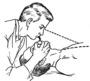 Исскуственная реанимация изо рта в рот через трубку Для проведения искусственного дыхания методом «изо рта в рот» оказывающий помощь становится сбоку от пострадавшего, а если пострадавший лежит на земле, то опускается на колени, одну руку подсовывает под шею, вторую кладет на лоб и максимально запрокидывает голову назад, I и II пальцами зажимает крылья носа, свой рот плотно прижимает ко рту пострадавшего, делает резкий выдох. Затем отстраняется для осуществления больным пассивного выдоха. Объем вдуваемого воздуха — от 500 до 700мл. Частота дыхания—12 раз в 1 мин. К нтролем правильности проведения искусственного дыхания является экскурсия грудной клетки —- раздувание при вдохе и спадение при выдохе. При травматических повреждениях нижней челюсти или в случаях, когда челюсти плотно стиснуты, рекомендуется проводить ИВЛ методом «изо рта в нос». Для этого, положив руку на лоб, запрокидывают голову назад, другой рукой захватывают нижнюю челюсть и плотно прижимают ее к верхней челюсти, закрывая рот. Губами захватывают нос пострадавшего и производят выдох. У новорожденных детей ИВЛ осуществляется методом «изо рта в рот и в нос». Голова ребенка запрокинута назад. Своим ртом реаниматор охватывает рот и нос ребенка и осуществляет вдох. Дыхательный объем новорожденного составляет 30 мл, частота дыхания — 25—30 в минуту. В описанных случаях ИВЛ необходимо осуществлять через марлю или носовой платок, чтобы предупредить инфицирование дыхательных путей лица, проводящего реанимацию. С этой же целью ИВЛ можно проводить с помощью 5-образной трубки, которая используется только медицинским персоналом (см. рис. 5, г). Трубка изогнута, удерживает корень языка от западения и тем самым предупреждает обтурацию дыхательных путей. 8-образную трубку вводят в ротовую полость изогнутым концом вверх, скользя по нижнему краю верхней челюсти. На уровне корня языка осуществляют поворот ее на 180°. Манжетка трубки плотно закрывает рот пострадавшего, а нос его зажимают пальцами. Через свободный просвет трубки осуществляют дыхание.