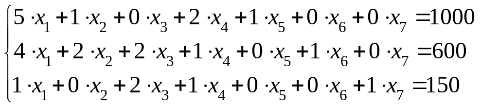 Для обращения системы ограничений-неравенств в систему уравнений прибавим к левой части каждого неравенства добавочные неотрицательные переменные x5 , x6 , x7 . Эти добавочные переменные в условиях данной задачи имеют конкретное экономическое содержание, а именно: объем остатков сырья каждого вида после выполнения плана выпуска продукции.