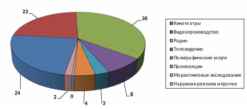 Самую большую долю доходов имеет реклама на радио (36%). Доходы от размещения рекламы в кино и от видеопроизводства практически сравнялись в 2011г. (рисунок 6). Доходы от промо-мероприятий и телевидения снижаются, появляется новое направление – маркетинговые исследования, которые не несут за собой больших объемов прибыли.