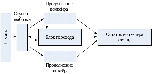 Каждая извлеченная из памяти и помещенная в основной буфер команда анализируется блоком перехода. При обнаружении команды условного перехода (УП) блок перехода вычисляет исполнительный адрес точки перехода и параллельно с продолжением последовательной выборки в основной буфер организует выборку в дополнительный буфер команд, начиная с точки УП. Далее блок перехода определяет исход команды УП, в зависимости от которого подключает к остатку конвейера нужный буфер, при этом содержимое другого буфера сбрасывается. Упрощенный вариант подобного подхода применен в IBM 360/91, где дополнительный буфер рассчитан на одну команду, то есть выигрыш достигается за счет исключения времени на выборку команды из точки перехода.