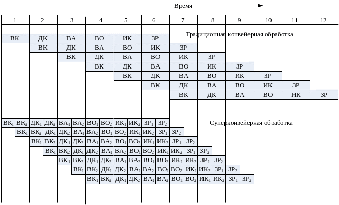 Рис. 54. Традиционная и суперконвейерная обработка команд.