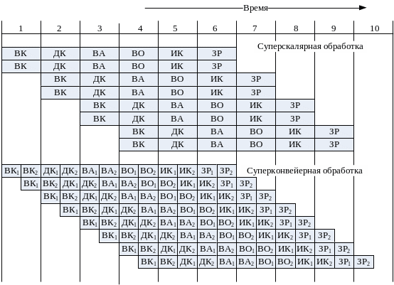 Рис. 58. Сравнение суперскалярного и суперконвейерного подхода.