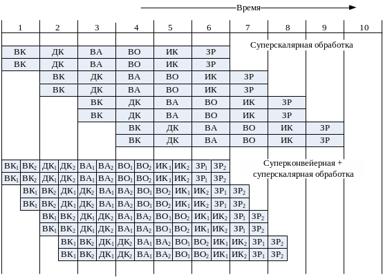 Рис. 59. Сравнение эффективности стандартной суперскалярной и совмещённой схем суперскалярных вычислений.