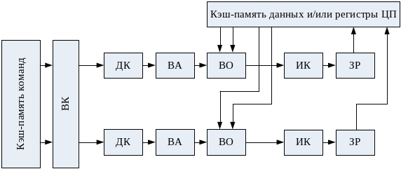 Рис. 56. Суперскалярный процессор с двумя конвейерами.