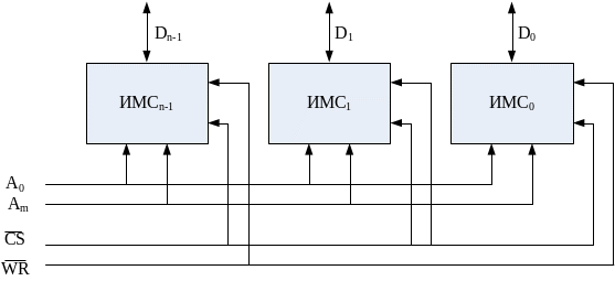 Емкость основной памяти современных ВМ слишком велика, чтобы ее можно было реализовать на базе единственной интегральной микросхемы (ИМС). Необходимость объединения нескольких ИМС ЗУ возникает также, когда разрядность ячеек в микросхеме ЗУ меньше разрядности слов ВМ.