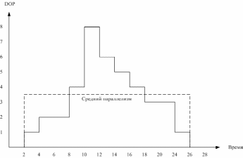Число процессоров многопроцессорной системы, параллельно участвующих в выполнении программы в каждый момент времени t, определяют понятием степень параллелизма D(t) (DOP, Degree Of Parallelism). Графическое представление параметра D(t) как функции времени называют профилем параллелизма программы. Изменения в уровне загрузки процессоров за время наблюдения зависят от многих факторов (алгоритма, доступных ресурсов, степени оптимизации, обеспечиваемой компилятором и т. д.). Типичный профиль параллелизма для алгоритма декомпозиции (divide-and-conquer algorithm) показан на рис. 86.