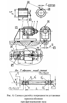 Пример 6. Заготовка (рис.6 ) устанавливается на палец приспособления для обработки паза в размеры "c" и "h" . Для выполнения заданного техническими требованиями условия параллельности боковых поверхностей паза A и образующей базового отверстия Б в качестве расчетного параметра следует принять допуск параллельности образующей цилиндрической поверхности Б пальца, на который устанавливается заготовка, относительно боковой поверхности Г направляющих шпонок корпуса приспособления.