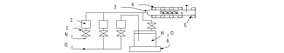 Для термического оксидирования применяют то же оборудование, что и для диффузионного легирования, например диффузионные электропечи типа СДО-125/3, трех- или шестикамерные автоматизированные системы типа АДС-6-100. Камера установки (рис.5) из дважды переплавленного в вакууме кварца проходит через муфель печи с резистивными нагревателями. Температура в рабочей зоне поддерживается с точностью 0,5 оС в диапазоне 700...1250 оС. Процесс проводят способом открытой трубы, т.е. через кварцевую трубу-камеру непрерывно проходит сухой или влажный кислород. Для обеспечения подачи в камеру строго определенного количества паров воды испарение ведут в стационарном режиме. Для этого определенное количество воды (дозу) заливают в герметичный сосуд-дозатор. Поступающий в дозатор кислород проходит сквозь воду, захватывая пары воды. Такой дозатор барботажного типа нагревают до температуры 60...95 оС.