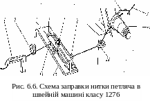 Нитка 9 (мал. 6.6) петлителя з бобіни на стійці проводиться через отвори нитенаправителя 8, між тарілочками-шайбами регулювальника натягнення 10, нитенаправители 7, 11 і 6, через отвір 5 нитенаправителя, під нитеотражатель 4, над кулачковим ниткоподатчиком 3, в очко нитенаправителя 13, нитенаправитель 2 і в очки петлителя 1.