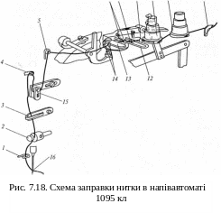 У машині використовується одна нитка. Голкова нитка від бобіни із стійкою проводиться через отвір нитенаправителя 11 (мал. 7.18) і далі під шайби заднього регулювальника натягнення 10 з лівого боку, під шайби переднього регулювальника натягнення 9 з правого боку, за нитенаправитель 8, над скобою 12 звільнень нитки, в очко дротяного нитенаправителя 7, між двома шпильками 6, під притискну пластину 13, між тією, що направляє шпильками 14, в очко дротяного нитенаправителя 5, під роликом направите -ля 15, в отвір ниткоподатчика 4, встановленого на игловодите
