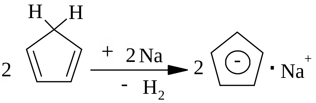 Синтез металлоценов является процессом многостадийным, в котором одним из основных исходных компонентов является циклопентадиен и его производные. Молекула циклопентадиена сформирована из пяти атомов углерода, один из которых полностью насыщен и связан с двумя атомами водорода. Один из этих атомов водорода проявляет кислые свойства. Поэтому, при взаимодействии циклопентадиена с металлическим натрием подвижный атом водорода восстанавливается. В результате циклопентадиен превращается в отрицательно заряженный циклопентадиенильный анион с ароматической циклической структурой, где противоином является ион натрия.
