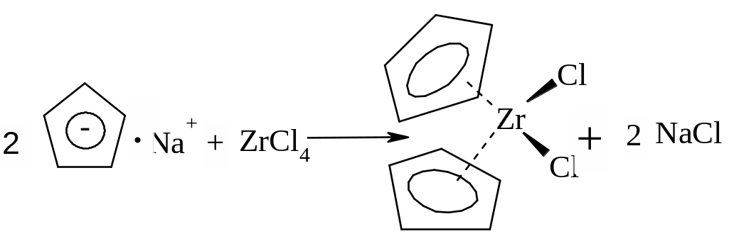 Для полимеризации олефинов наиболее широко используют сэндвичевые и полусэндвичевые металлоцены переходных металлов IV группы: Zr. Hf. Ti. Для получения, например, ди-хлорцирконоцена проводят реакцию между ZrCl4 и циклопентадиенилнатрия в среде кипящего толуола: