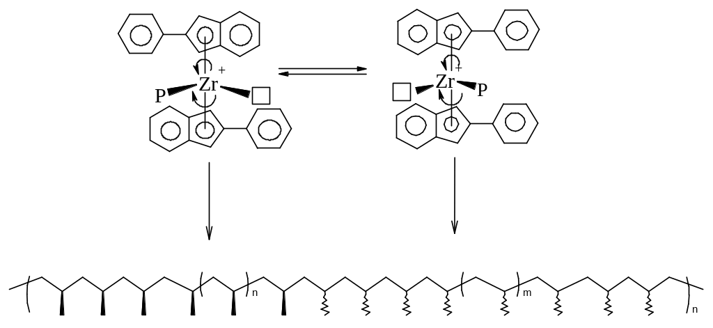 Получение блочного стереорегулярного полипропилена связано с созданием так называемых «осцилирующих» цирконоценовых катализаторов. Типичным представителем этого класса соединений является ди-(2-фенилинденил) дихлорид циркония. У этого металлоцена нет мостика между двумя инденильными циклами. Это означает, что два цикла могут свободно вращаться вокруг оси. Конфигурация молекулы, когда циклы расположены друг над другом называют мезо-формой. Если однотипные циклы направлены в разные стороны, то это будет рацемической или рац-формой. Циклы находятся в непрерывном процессе вращения относительно друг друга. В результате соединение некоторое время проводит в рацемической форме, затем поворачивается и принимает мезо-форму. Когда цирконоцен находится в рацемической форме, молекулы пропилена могут приближаться к нему только с одной ориентацией – той, которая обеспечивает образование изотактического полипропилена. Но когда цирконоцен переходит в мезо-форму, молекула пропилена может подходить к активному центру с произвольной ориентацией. В результате образуется блок атактического полипропилена. За один цикл вращения происходит присоединение четырех молекул пропилена в изотактический блок и четырех в - атактический.