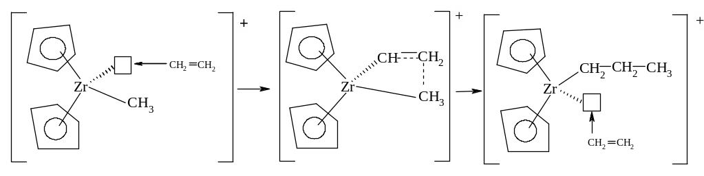 Ион металлоцения находится в катионной форме. Внутри этого катиона существует координационная ненасыщенность на одно вакантное место, которое стабилизируется анионом [Cl.МАО]-. Метастабильность внутренней координационной сферы катиона металлоцения является той важной причиной, по которой молекула олефина с энергетической выгодой для металлоцения занимает вакантное координационное место. Затем молекула олефина внедряется между катионом переходного металла и карбанионом метильной группы и присоединяется к ней. В результате такого миграционного полиприсоединения, протекающего согласно механизма Косси-Альмана, вакантное координационное место и конец растущей полимерной цепи меняются местами. Хотя процесс идет внутри катиона металлоцения, тем ни менее полимеризация, аналогично металлокомплексным системам Циглера-Натта протекает по координационно-анионному механизму.