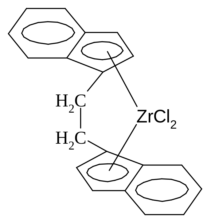 Циклопентадиенильные металлоцены используют для полимеризаци этилена и получения атактического полипропилена. Для того, чтобы оказалась возможной стереоспецифическая полимеризация пропилена были синтезированы стерически затрудненные анса-металлоцены, содержащие не только циклопентадиенильные (Cp), но и инденильные (Ind) и флуоренильныt (Flu) лиганды.