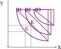 Полезность любых наборов товаров Х и Y на кривой D1 одинакова. Но она меньше полезности этих наборов на кривых D2 и D3.