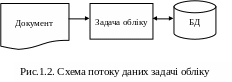 Для реалізації задач обліку використовується схема потоку даних, наведена на рис. 1.2. Документ – це вхідний документ (нормативно-довідкові дані, звіти). Задача обліку – це задача обліку даних конкретного виду документів. БД – це база даних, в якій зберігається інформація.