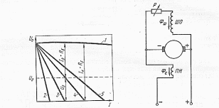 Для поддержания постоянства напряжения на клеммах генератора при увеличении нагрузки (жесткой внешней характеристики 1, рис. 4.7), кроме основной шунтовой обмотки ШО, предусмотрена действующая согласно с основной последовательная обмотка ПН, усиливающая магнитный поток при возрастании нагрузки (рис. 4.8).