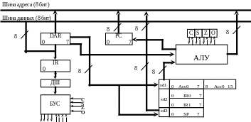 8-разрядный счетчик адреса команды (РС) – программно недоступен, используется для вычисления адреса очередной команды;