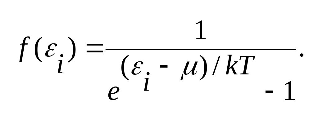4. Для бозонів значення м в (4.3) не можуть бути позитивними, інакше при εi < μ виявиться, що f < 0, а це позбавлено фізичного значення. Таким чином, для бозонів μ ≤ 0. У макросистем із змінним числом бозонів (до числа яких відносяться, наприклад, фотони) μ = 0, і формула (4.3) переходить в